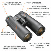 • Le télémètre, avec une portée allant jusqu'à 1,5 km, une précision de +/- un mètre et des modes balistiques pour les tirs de près/de loin, au tir à l'arc et à la carabine, fournit des données précises.