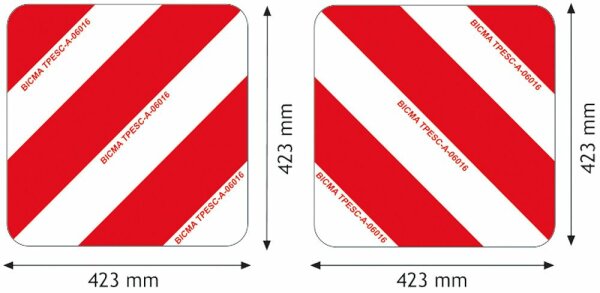 - Satz bestehend aus zwei Tafeln - beidseitig bedruckt - Reflektierend Kl. 1 - Aluminium - DIN11030 und TPESC (für Frankreich) - Warntafeln zur Kennzeichnung von LKW, Tiefgänger und Landwirtschaftsmachinen 423 x 423 mm, abgerund. Ecken, DIN11030+TPESC, reflektierend Kl. 1