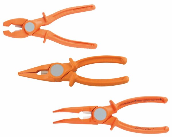 3er-Set vollisolierte Zangen für Arbeiten unter Spannung. Profi Ausführung aus glasfaserverstärktem Kunststoff. Set beinhaltet: - Kombizange CA66000C - Spitzzange gerade CA66303C - Spitzzange abgewinkelt CA66404CC - Zertifiziert nach EC 60900 - Klasse 0, bis 1.5 kV DC / 1.0 kV AC - mit keramischen Schneiden Sie sparen gegenüber dem Einzelpreis CHF 75.00 für Arbeiten an Hybrid- & Elektrofahrzeugen