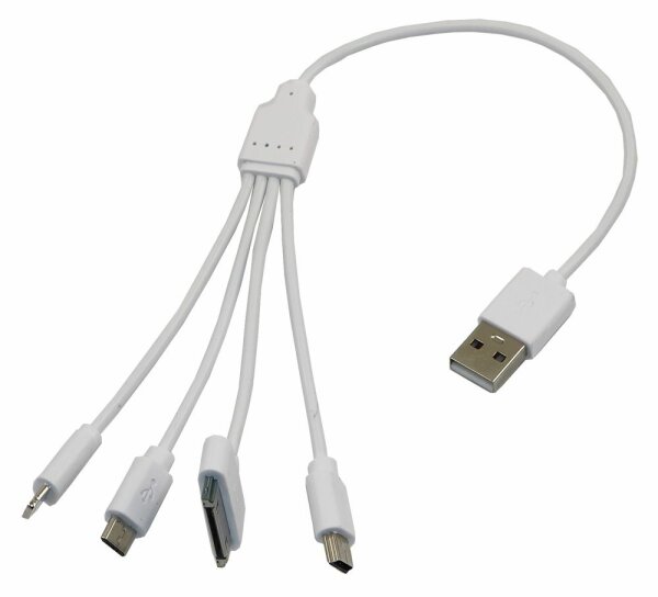 4in1 Universal USB Ladekabel für Apple iPhone/iPad und andere Mobiltelefone/Tablets/Geräte mit USB Schnittstellen nach EN 62684:2011 Eingang: USB Ausgänge/Anschluss für: - iPhone 30pol (4/4s) - iPhone Lightning (5/5s/5c/6) - Mini-USB - Micro-USB
