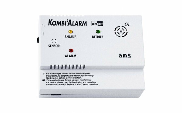 Das AMS-KOMBIALARM ist ein autarkes Warnsystem mit eingebautem Sensor und akustischem Signalgeber. Es ist für den Anschluss an 12 V DC ausgelegt. Das System ist mit einer ganz speziellen Sensorik ausgestattet, die es erlaubt, das Gerät zugleich sowohl als Gasmelder als auch als Narkosegaswarnanlage einzusetzen.  Bei den Gasen Butan/ Propan/Methan liegt die Ansprechschwelle weit unter der unteren Zündgrenze des Gases, d. h. dem Punkt, an dem ein explosionsfähiges Gemisch entsteht. Die Einstellung der Empfindlichkeitsschwelle der Sensorik erfolgt vollautomatisch.