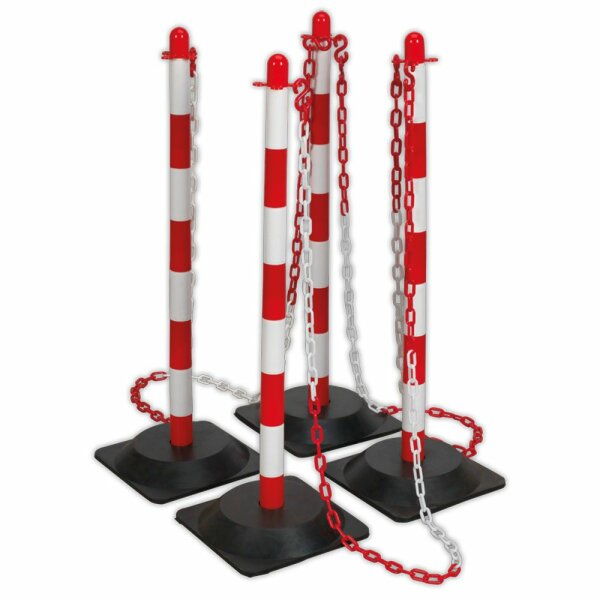 Set, bestehend aus 4 Stück rot/weiss/rote Pfosten mit Sockel und 1 Stück 25 m lange rot/weiss/rote Kunststoff-Kette zur Absperrung bei Arbeiten an Hybrid- oder Elektrofahrzeugen. bei Arbeiten an Hybrid- und Elektrofahrzeugen