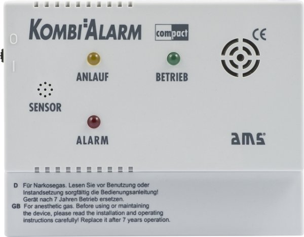Autarkes Warnsystem, mit akustischem Signalgeber und eingebautem Sensor. Spürt noch vor einer betäubenden Wirkung Narkosegase in geringsten Konzentrationen auf.