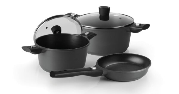 The high-quality 5-piece aluminum pot set has a non-stick coating and removable handles.Further specifications:1 pot with glass lid, silicone knob and removable handles: Ø 20 cm, H 10 cm, 2.8 l1 pot with glass lid, silicone knob and removable handles: Ø 24 cm, H 11,5 cm, 4,5 l1 pan with removable handle: Ø 24 cm, H 5,5 cm, 2 lThick walls: 0,2 cmThick bottom: 0,4 cm