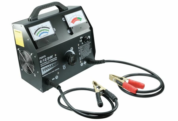 Batterie-Prüfgerät mit analogen Volt- & Amperemeter für präzise Belastungstests von 6, 12 + 24 V Blei-Säure-Batterien*, Lade- und Anlasssystemen. Stufenloser Belastungsstrom von 0...2000 Ampère; eindeutige Resultate dank farbiger Skalen; Robustes Metallgehäuse (350 x 355 x 175 mm) mit 2 x 1.4 m langen Kabel und grossen Batterieklemmen; eingebauter Warnsummer und Lüfter maximal 20 Sekunden Testdauer Abkühlzeit von 2 Minuten für Belastungstests von Blei-Säure-Batterien
