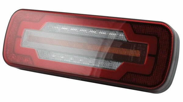 - Innovative Glowing Body Technologie als Standlicht - Erhöhte Sichtbarkeit durch großdimensionierte Leuchtfläche der Funktionen Stand- & Bremslicht - Vertikaler Anbau: ohne dynamischen Fahrtrichtungsanzeiger Horizontaler Anbau: mit dynamischen Fahrtrichtungsanzeiger - Chemikalien - und kratzbeständige Lichtscheibe **Open End Anschluss auf Anfrage lieferbar** 284 x 100 x 37 mm, 7-pol AMP (DIN72585) vertikal + horizontal mont.
