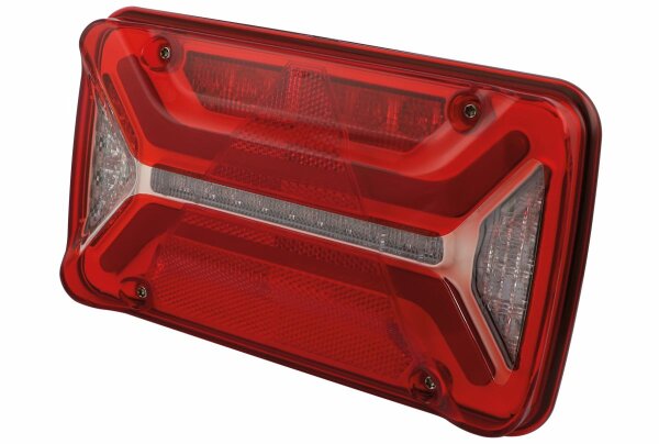- LED - Heckleuchte mit wechselbarer Lichtscheibe - Ersatzlichtscheibe beidseitig verwendbar - Innovative Glowing Body Technologie als Standlicht - Erhöhte Sichtbarkeit durch großdimensionierte Leuchtfläche der Funktionen Stand- & Bremslicht - Dynamischer Fahrtrichtungsanzeiger - ISO-Impuls 13207-1 als Standard (bei 24 V) - Chemikalien - und kratzbeständige Lichtscheibe - SMCG (Sidemarker Control Gear) inkludiert ECE 48, Rev. 6 - Intelligente Teilabschaltung des Bremslichtes bei Aktivierung der Nebelschlussleuchte - Optional mit 2 pol. Anschluss auf der LeuchtenRückseite (Verteilerfunktion) **Version Trailer** 240 x 140 x 79 mm, 7-Pol ASS2+ 2-pol ASS2 mit SMCG