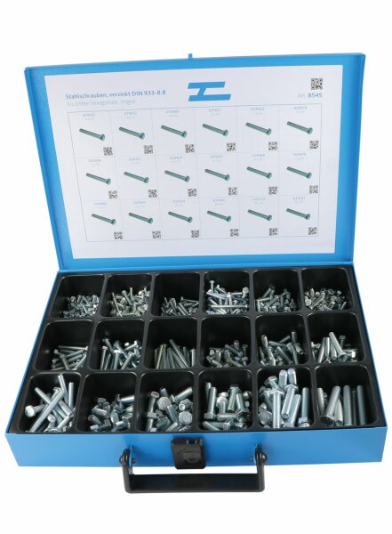 Assortiment Vis à tête hexagonale cl.8.8 filetage total dans une boîte métallique avec 18 compartiments. Contenu: 650 vis DIN 933 - 8.8 dans les tailles M4x10 - M8x50 zinguage blanc zingué - DIN 933 - 8.8 - M4x10 - M8x50