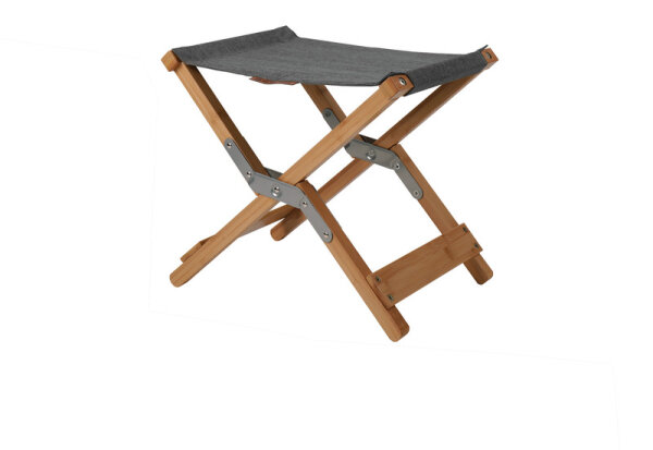 Der Bambus-Hocker aus der exklusiven "Holiday Travel"-Produktserie ist gleichzeitig als Beinauflage zu verwenden. Er ergänzt den "Holiday Travel"- Lounge Faltsessel, der aus denselben Materialien gefertigt wurde. Das Gestell ist aus hochwertigem Bambus, der Stoff exklusives grau-meliertes Polyester mit einem Kunstleder-Etikett.