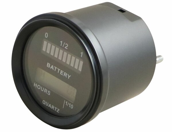 Betriebsstundenzähler und Batterieanzeige in einem Bauteil. • Betriebsstundenzähler elektronisch • Totalstunden / Teilstunden • Batterie Ladezustand Anzeige • Voltanzeige Digital und Balken • Unterspannung / Überspannung Anzeige • IP65 • Einbauloch Durchmesser 52 mm Neu: Betriebsstunden einmalig einstellbar während der 1. Betriebsstunde, (beispielsweise beim Ersatz eines defekten Zählers). Bedienung und Programmierung der Anzeige nur von Unterseite möglich wegen IP Schutz. Anwendungsbereiche: Elektrofahrzeuge 2/4 Rad, Elektrostapler, Reinigungsmaschinen, uvm. Steckerbelegung: 1 - Stundenzähler Ein --> Negativ getriggert (Masse) 2 - Zündungsplus 3 - nicht benötigt 4 - nicht benötigt 5 - Batterie - 6 - Stundenzähler EIN --> Positiv getriggert (Plus) 7 - Batterie + bei 12 - 36 V 8 - Batterie + bei 24 - 48 V ø 52 mm , 12/24 V