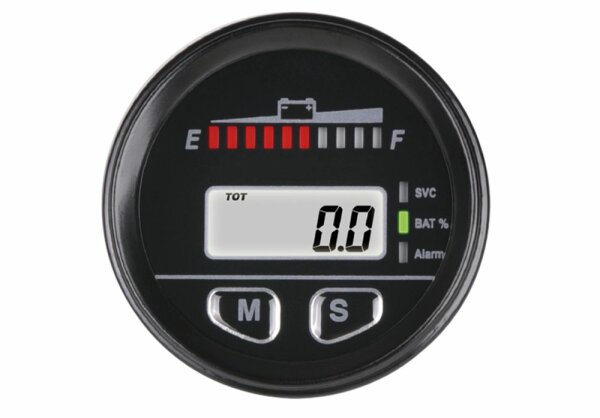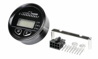 Batteriestandanzeige, Betriebsstundenzähler und Wartungsanzeige in einem Bauteil. - Betriebsstundenzähler elektronisch - Totalstunden - LCD hinterleuchtet - Batterie Ladezustand Anzeige - Voltanzeige Digital und Balken - Unterspannung / Überspannung Anzeige - IP65 - 12-48 VDC - Kabelsatz vorverkabelt - geschalteter Ausgang 5V 50mA bei Batteriekapazität < 10% EIN - Einbauloch Durchmesser 60 mm - Startzeit einmalig einstellbar während der 1. Betriebsstunde, (beispielsweise beim Ersatz eines defekten Zählers). Anwendungsbereiche: Elektrofahrzeuge 2/4 Rad, Elektrostapler, Reinigungsmaschinen, Quad, Schneemobile, Traktoren, usw. Kabelfarben: 1 - schwarz - Batterie - 2 - gelb - Stundenzähler Ein --> Positiv getriggert 3 - grün - Zündungsplus (LCD ein) 4 - rot - Batterie + 5 - schwarz - Ausgang 5V max. 50mA 6 - nicht benötigt 7 - nicht benötigt 8 - gelb - Stundenzähler Ein --> Negativ getriggert ø 60 mm , 12/24 V, Serviceanzeige LCD