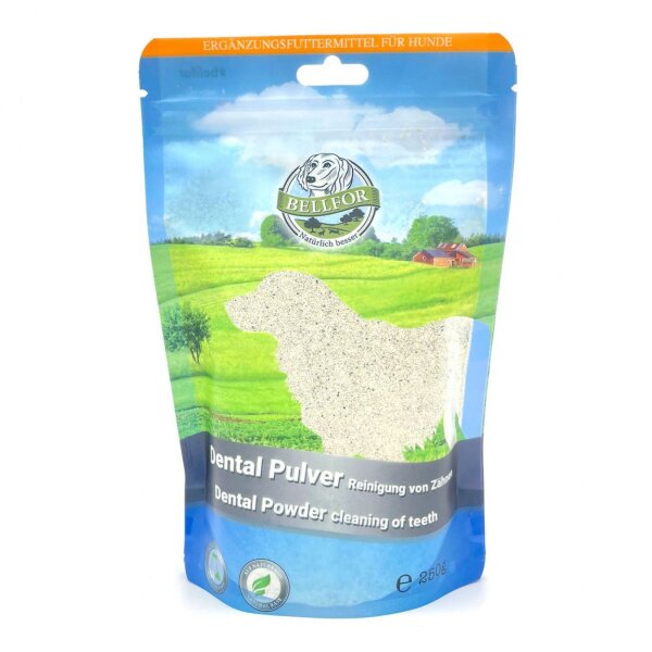 Bellfor Dental Pulver verringert Zahnstein und Mundgeruch bei Hunden auf natürliche Weise Bellfor Dental Pulver ist eine natürliche Ergänzungsfuttermittel, mit der Sie die tägliche Zahnpflege unterstützen und für ein dauerhaft gesundes Gebiss bei Ihrem Hund sorgen können. Was macht Bellfor Dental Pulver so besonders? Gesunde Zähne sind für das Wohlbefinden Ihres Hundes von entscheidender Bedeutung. Mit Bellfor Dental Care sorgen Sie dafür, dass das Gebiss Ihres Vierbeiners auf schonende Weise von Zahnstein befreit und das Entstehen von neuem Zahnbelag verhindert wird. Wie bei allen unseren Produkten verwenden wir auch für Bellfor Dental Care ausschließlich natürliche Rohstoffe, die eine hohe Produktqualität und eine optimale Verträglichkeit gewährleisten.