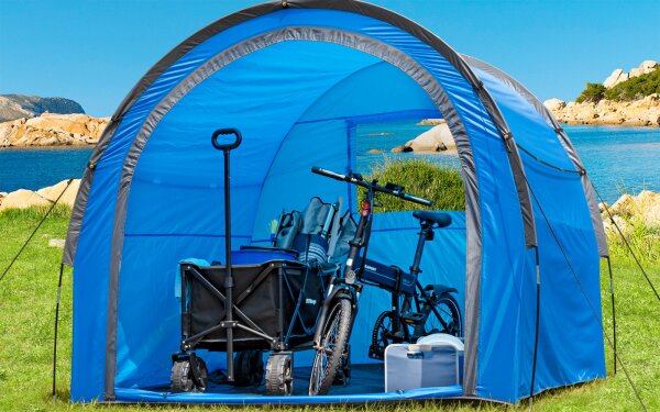 Das schnell aufgebaute Universalzelt eignet sich nicht nur zum Unterstellen von Fahrrädern, sondern bietet auch viel Platz für andere Campingutensilien. Der Eingang ist mit einem Reißverschluss verschließbar und auf der Rückseite befindet sich ein Fenster mit Moskitogaze und Abdeckung zum Hochrollen. Perfekt auch als Fahrradgarage geeignet.