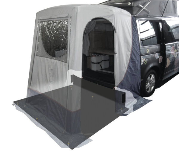 Heckzeltboden mit integriertem Windschutz. Einfache Anbringung am Heckzelt durch Klettverschlüsse an der Zeltwand. Material: PE Passend für Heckzelte Trapez & Vertic Trafic und Hiace.