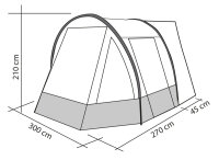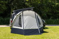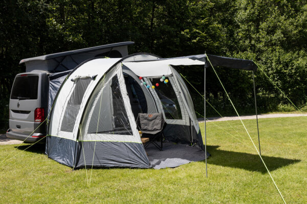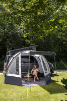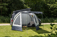 The entry-level model for camping vans. The 1-tunnel awning for vans with large door in the front, which can also be used as a sun awning. In both sides windows with 1/2 mosquito net and 1/2 transparent PVC. Additional door in right side wall (can also be used as a sun sail), D-shape door in back wall (can be opened on one or both sides) and airlock (45cm). Incl. 3 roof reinforcement rods for more stability and to avoid water pockets in case of rain.Piping length 264cmVehicle connections: Keder Ø 5/8 mm, lock rod u. Loops for fixation with tension linesMaterial: 185T polyester, water column 3,000mm, flame retardantDimensions: W 320 x D 250 (+ lock 45cm) x H (entrance) 210cm, mounting height 180-220cmPack size: 67 x 22 x 20cm