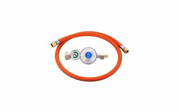 Set mit 85 cm Gasschlauch, Gasdruckregler und Flaschenmanometer. Mit diesem Druckregler können Niederdruckgeräte an eine Universalgasflasche angeschlossen werden.