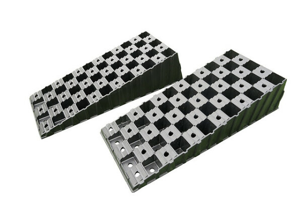 Cale pour caravanes et camping-cars à empreinte large pour éviter l'enfoncement dans des sols meubles La surface d'enfoncement brevetée garantit que la cale ne glisse pas si aucun tapis antidérapant n'est utilisé.