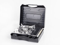 Der Camp4 Gourmet Kartuschenkocher zeichnet sich durch seine hohe Leistunge und dem kleinen Packmaß aus. Es wird durch eine Bajonettkartusche betrieben. Die Flamme ist stufenlos verstellbar. Es verfügt über eine Zündsicherung und einer Piezo-Zündung. Der hochwertige Gourmet-Kocher hat eine Edelstahl-Oberfläche, und kommt in einem praktischen und handlichen Kunststoff-Tragekoffer, das ganze bei nur ca. 1,8 kg Gewicht.Hinweis:Der maximale Durchmesser der zu verwendenden Pfanne ist 340 mm.