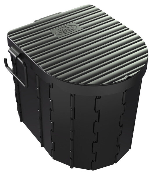 Die leichte und faltbare Camp4 Campingtoilette Mini in schwarz kommt mit einsteckbarem Toilettenpapierhalter, einer praktischen Tragetasche und 12 Toilettenbeutel.