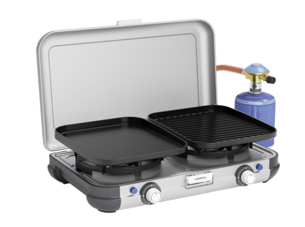 Der 2-Flammen-Herd mit abnehmbarem Grillrost und Planchaplatte gibt jederzeit die nötige Flexibilität verschiedene Gerichte zu kochen oder zu grillen.