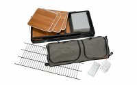 Die Küchenbox verfügt über zwei Fächer, welche separat voneinander abgetrennt sind und mit jeweils einem Reißverschluss verschließbar sind. Zudem haben diese beiden Fächer einen Zwischenboden. Dadurch wird das Fach auf zwei Ebenen geteilt. Außerdem gibt es ein integriertes Spülbecken, eine große Arbeitsfläche von 100 x 50 cm, zwei Gewürzregale in der Abdeckung, welche eingehängt werden, sowie Hacken zum Aufhängen der Küchenutensilien oder Handtücher. Der Deckel stellt im aufgeklappten Zustand zusätzlich einen Windschutz zum Kochen dar.