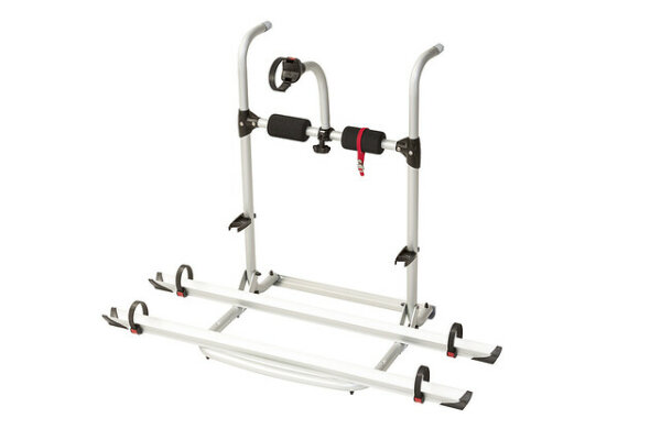 Geeignet für die Heckmontage an Reisemobilen. An den Fahrradschienen befinden sich bereits Ratschen-Laschen mit welchem das Fahrrad zusätzlich gesichert werden kann. Der Fahrradträger ist mit einer weiteren Schiene erweiterbar auf ein 3. Fahrrad. Wenn keine Fahrräder transportiert werden, kann der Träger einfach zusammengeklappt werden wodurch er nur eine breite von 30 cm hat.