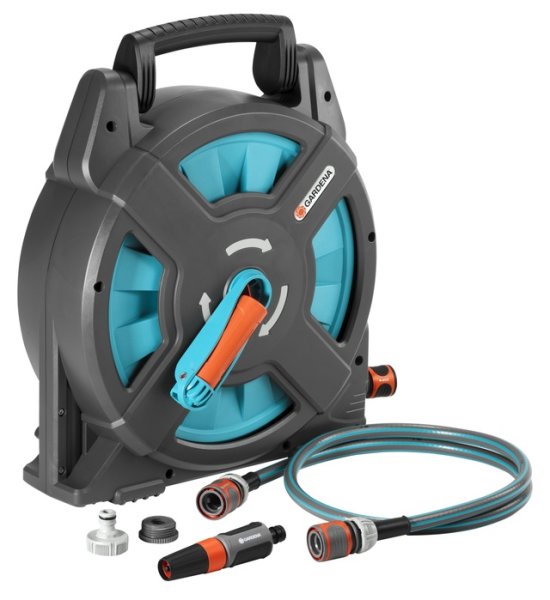 Für den Einsatz bei Camping, Freizeit und Wassersport. Leicht und Platz sparend, mit einklappbarer Handkurbel und Tragegriff. Gewebeschlauch (Durchmesser 11 mm). Komplett mit Original Gardena Systemteilen und Spritze. Sofort einsatzbereit - einfach benötigte Schlauchlänge abrollen. Mit 16,5 m (15 m + 1,5 m Anschlussgarnitur) Qualitätsschlauch.