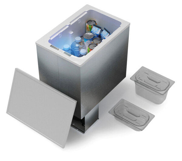 It works for 3 or more days with a 100 Ah leisure battery. Temperature control with innovative membrane LED digital thermostat. Low noise level and reduced consumption during the night.