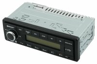 - 1-DIN, sehr kurze Einbautiefe von nur 90 mm (ohne Stecker) - gespeicherte Sender und Einstellungen bleiben auch nach Trennen der Batterie erhalten - kann auch ohne Zündkontakt eingeschaltet werden, schaltet nach 1 Stunde zum Schutz der Batterie ab (Funktion kann ein- oder ausgeschaltet werden) - DAB+ und FM/AM - bei schlechtem DAB-Empfang schaltet der Sender autom. auf FM um (sofern verfügbar) - Leistung 4 x 41 W - S/F (Service Following) autom. Umschaltung auf richtige Senderfrequenz beim Fahren in anderen Sendergebieten - Bluetooth-Freisprecheinrichtung, wahlweise über eingebautes Frontmikrofon oder mitgeliefertes, externes Mikrofon mit Cliphalterung für Sonnenblende - Musikstreaming ab Handy via Bluetooth A2DP - AUX-In-Eingang für externe Tonquelle wie Handys, MP3-Player u.s.w. - USB-Steckdose für Wiedergabe von MP3, WMA und ID3-Files, max. Ladeleistung von 5V 0.5A - Antennenanschluss DAB+: SMB männlich mit Phantomspeisung (Ausgangsspannung 12 V) - Antennenanschluss FM/AM: DIN weiblich - DAB+ Band III 174 - 240 MHz - ISO-Steckanschluss (Iso-Steckersatz optional) **ACHTUNG: keine Schnittstelle für Bedienung am Lenkrad (Lenkradinterface)** Lieferumfang: - passive Scheibenklebeantenne ohne Massenanschluss. ACHTUNG: funktioniert nicht bei wärmedämmenden oder metallbedampften Scheiben. Alternativ anderes Antennensystem verwenden. - Externes Mikrofon mit Cliphalterung für Sonnenblende - Einbaurahmen - Demontageschlüssel - Antennenadapter ISO weiblich > I522 90 mm Einbautiefe (ohne Stecker), permanenter Speicher für Sender und Einstellungen, Bluetooth für Freisprecheinr. und Musik-Streaming, eingebauter und extern. Mikrofon, USB, ohne Schnittstelle für Lenkradbedienung