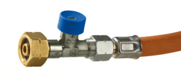 Hose line for connection to permanently mounted low pressure regulators with inlet AG M 20 x 1.5. The hose rupture protection prevents gas eruption in case of damage. Hose dimension 6.3 x 5 mm, PS 30 bar.Countries: IT/GR/CY