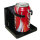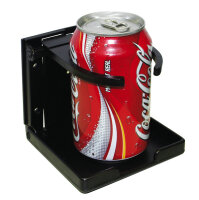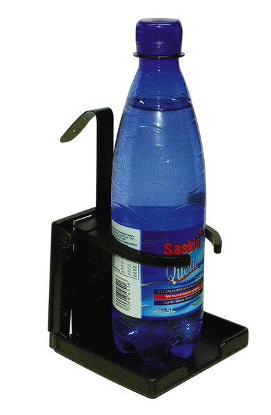 Cup holder for the transportation of open cans or bottles. Mounting at vertical surfaces or simple to hang in. Variable clamp system. Closeable. Colour: black.