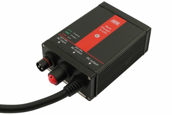 Der DEFA MultiCharger 1 x 12 A ist ein Ladegerät, das für den Festeinbau in Fahrzeugen ausgelegt wurde. Er eignet sich für alle Bleisäurebatterien (auch AGM, Gel, Start-Stop) bis 150 Ah. Mit den DEFA PlugIn Anschlüssen lässt sich das Ladegerät perfekt in das komplette DEFA System integrieren. Der DEFA MultiCharger 1x12A toleriert eine Parallel-Last bis zu 6 Ampere und lädt gleichzeitig die Batterie. Im Lieferumfang des Ladegeräts ist ein zwei Meter langes Batterie-Anschlusskabel mit integriertem Temperatursensor und ein Verbindungskabel enthalten. Sollten Sie für Ihre Anwendung eine integrierte Zündunterbrechung (Startsperre) benötigen, weichen Sie bitte auf den MultiCharger MC1x20 aus. Rücklaufstrom geringer als 1 mA. 7-stufig, vollautomatisch, für Nass-, MF-, AGM-, Calcium/Calcium- und GEL-Batterien, bis 150 Ah ** besonders für Fixeinbau bei 12 V-Systemen geeignet ** ** Achtung: das 230 VAC Eingangskabel muss separat bestellt werden ** Ladekabellänge: 2 m 138 x 98 x 53 mm, für Festeinbau, MultiCharger