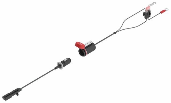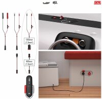 Die LED zeigt den Batteriestatus an: Rot - muss geleden werden Gelb – sollte geladen werden Grün - OK 1x 1300 mm, 1x 800 mm, mit Lochkabelschuhen, mit Steckdose