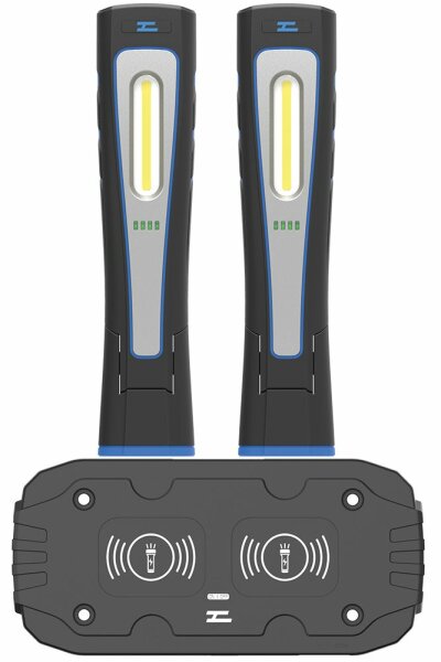 Doppelset COB-LED Handlampe MAXI mit kabellosem Induktiv Ladesystem, Befestigungsmöglichkeit durch starken Magnet-Fuss mit 180° Klapp-Mechanismus sowie 2 Magnethaltern plus Haken auf der Rückseite. Keine anfälligen Ladebuchsen mehr, zudem ist die Leuchte auf dem Ladepad immer am selben Platz griffbereit und geladen. Ideal für Profi-Handwerker. Set beinhaltet: - 2 x Handlampe HL50 MAXI - Doppel Induktiv Ladepad HLpad2 - Netzadapter 230 V / 5 V 2 A - Ladekabel Doppel Ladepad, 2 x Handleuchte MAXI