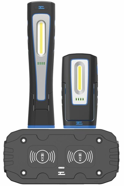 Robuste COB-LED Handlampe MINI und MAXI mit kabellosem Induktiv Ladesystem, Befestigungsmöglichkeit durch starken Magnet-Fuss mit 180° Klapp-Mechanismus sowie 2 Magnethaltern plus Haken auf der Rückseite. Keine anfälligen Ladebuchsen mehr, zudem ist die Leuchte auf dem Ladepad immer am selben Platz griffbereit und geladen. Ideal für Profi-Handwerker. Set beinhaltet: - Handlampe HL30 MINI - Handlampe HL50 MAXI - Doppel Induktiv Ladepad HLpad2 - Netzadapter 230 V / 5 V 2 A - Ladekabel Doppel Ladepad, Handleuchten MINI und MAXI