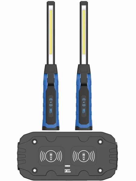 Doppelset COB-LED Handlampe SLIM mit kabellosem Induktiv Ladesystem, Befestigungsmöglichkeit durch starken Magnet-Fuss mit 180° Klapp-Mechanismus sowie 2 Magnethaltern plus Haken auf der Rückseite. Keine anfälligen Ladebuchsen mehr, zudem ist die Leuchte auf dem Ladepad immer am selben Platz griffbereit und geladen. Ideal für Profi-Handwerker. Set beinhaltet: - 2 x Handlampe HL100 SLIM - Doppel Induktiv Ladepad HLpad2 - Netzadapter 230 V / 5 V 2 A - Ladekabel Doppel Ladepad, 2 x Handleuchte SLIM