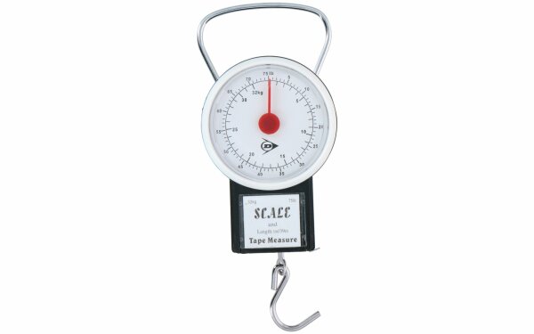 Die Dunlop Gepäckwaage kann max. 32 kg tragen und verfügt über ein integriertes Maßband.