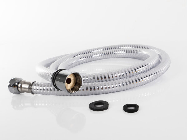 Duschschlauch, weißes Gewebe mit Metalleffekt. Länge 1,5 m, Überwurfmutter 3/8" x 1/2".