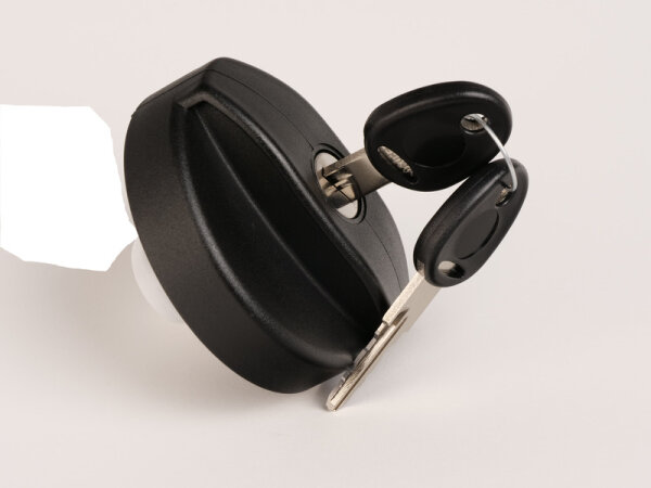 Abschließbarer Ersatzfüllstutendeckel in schwarzer Ausführung mit integriertem Schließzylinder und 2 Schlüsseln.