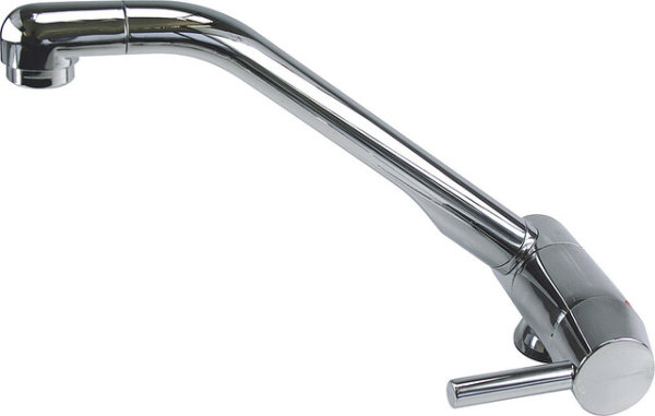 Hochwertige Küchennarmatur mit quer liegender Haushaltskeramikkartusche und langem, abgewinkeltem Auslauf.