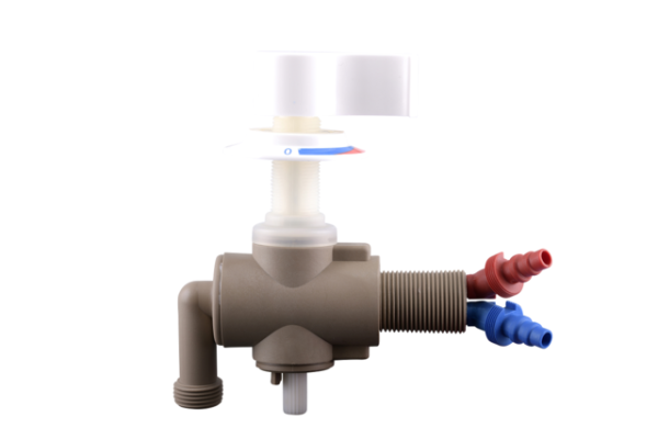 Untertisch-Mischbatterie mit Einknopfbedienung. Durch Drehung wird die Pumpe eingeschaltet. Zunächst kommt kaltes Wasser, das sich bei weiterer Drehung erwärmt. In Endstellung höchste Temperatur.