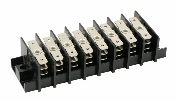 Flachsteckverbinder 8-pol mit je 6 x 6.3 mm Flachsteck-Anschlüssen pro Pol, parallel angeordnet; Sockel anschraubbar Nennspannung: 250 VAC Sockel: Kunststoff, schwarz Flachstecker: Messing vernickelt Deckel nicht lieferbar! 8 Pole à 6 Stecker = 48 Anschlüsse / 6.3 mm