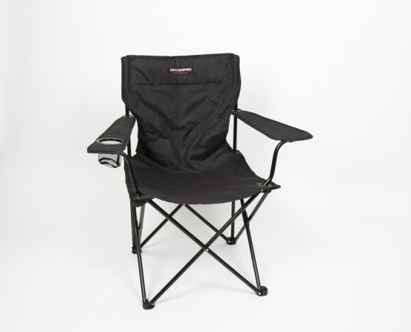 The comfortable folding chair Mahalo is folded and opened with a flick of the wrist. In one of the two armrests is a cup holder. The sturdy frame of black powder-coated steel and the high-quality black polyester material make this chair a classic among camping chairs.