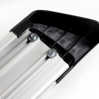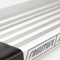 Geeignet für die folgenden Fahrzeugmodelle:Fiat Ducato ab 2006Peugeot Boxer ab 2006Citroen Jumper ab 2006Opel Movano ab 2021Durch die Freistufe - eine Zusatz-Trittstufe - wird die Höhendifferenz um ca. 20 cm, auf lediglich nur ca. 26 cm reduziert. Die Stufen selbst sind an die jeweilige Fahrzeugkonstruktion in vertikaler Richtung einstell-und anpassbar. Dieses geschieht mittels durchgängigen vertikalen Längsprofilen an der Unterseite jeder Trittstufe. So kann die Freistufe den unterschiedlichen Fahrzeugaufbauten, wie denen von Caravan-und Campingfahrzeugen, individuell angepasst werden. Die einzelne Stufe, hat ein Maß von (LxBxH) 790 x 130 x 80 mm und ist aus einem hochstabilen Aluminiumprofil gefertigt. An den kurzen Enden befindlichen sich je eine, fest verschraubte, abgerundete und schlagfeste Sicherheits-Kunststoffabdeckung. In die Oberfläche des Aluminiumbauteils ist eine rutschhemmende Profilierung eingearbeitet. Diese Profilierung gewährleistet ein sicheres Ein- und Aussteigen. Die Freistufe wird durch fahrzeugspezifische und mitgelieferte Edelstahl-Konsolen am und unterm Fahrzeugholm fest verschraubt. Die Konstruktion der Konsolen gewährleistet eine spätere Traglast von mindestens 140 kg pro Trittstufe.
