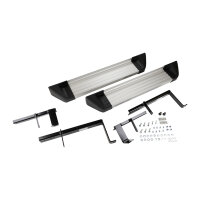 Für folgende Fahrzeugmodelle geeignet:Mercedes Sprinter 2006 - 2016,VW Crafter 2006 - 2016.Die Stufen selbst sind an die jeweilige Fahrzeugkonstruktion in vertikaler Richtung einstell-und anpassbar. Dieses geschieht mittels durchgängigen vertikalen Längsprofilen an der Unterseite jeder Trittstufe.So kann die Freistufe den unterschiedlichen Fahrzeugaufbauten, wie denen von Caravan-und Campingfahrzeugen, individuell angepasst werden. An den kurzen Enden befindlichen sich je eine, fest verschraubte, abgerundete und schlagfeste Sicherheits-Kunststoffabdeckung.In die Oberfläche des Aluminiumbauteils ist eine rutschhemmende Profilierung eingearbeitet. Diese Profilierung gewährleistet ein sicheres Ein- und Aussteigen.Die Freistufe wird durch fahrzeugspezifische und mitgelieferte Edelstahl-Konsolen am und unterm Fahrzeugholm fest verschraubt.Die Konstruktion der Konsolen gewährleistet eine spätere Traglast von mindestens 140kg pro Trittstufe.