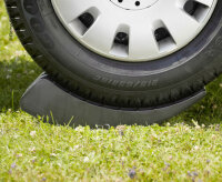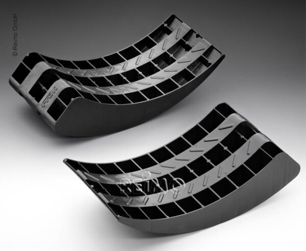 Innovativer Rundkeil. Farbe: schwarz. Geprüfte Stützlast: 1.250kg pro Rad. Stufenloser Höhenausgleich und reifenschonendes Parken! In seiner Form ist der Rundkeil abgestimmt auf die Rundung des Fahrzeugreifens. Ein homogenes Auffahren, sicheres Parken, einfaches stufenloses Auffahren (bis max. 10 cm) und optimale Schonung der Reifen wird ermöglicht. Die Verteilung der Last ist immer von oben, so kann der Rundkeil nicht wegrutschen. Es wird keine Auffahrhilfe benötigt! Gibt dem Fahrzeug Stabilität. Zugelassen bis zu einem Reifendurchmesser von ca. 70 cm. Achtung: Schürzenhöhe mindestens 28 cm!
