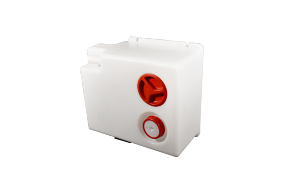 Tank for fixed installation in the seat. With 12 cm cleaning opening and one inlet connection 4 cm. Underside with drainage nozzle for passage through the floor of the vehicle, sealed with a ½" threaded plug on the inside of the tank. Attaches to four integrated slots.