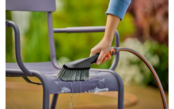 Die GARDENA Cleansystem Grundausstattung S soft sorgt für eine sanfte Reinigung kleinerer, empfindlicher Flächen im Außenbereich. Präzise und effektive Reinigung - auch an schwer zugänglichen Stellen Die Grundausstattung enthält alles, was für eine gründliche Reinigung benötigt wird. Es kann sofort losgelegt werden. Sowohl die Reinigungsspritze als auch die Bürste lassen sich einfach per „Klick“ am Wasserschlauch anschließen, um kleine, empfindliche Flächen, wie Gartenmöbel intensiv zu reinigen. Das flache und elastische Design ermöglicht eine präzise Reinigung, selbst in schwer zugänglichen Bereichen. Ecken und Kanten sind mit der Handwaschbürste kein Problem mehr. Flexibles Reinigen mit der Soft-Handbürste - Wasserdurchfluss nach Bedarf regulieren oder absperren Die sanfte Handbürste mit stufenloser Durchflussregulierung bietet die volle Kontrolle über die Wassermenge während der Reinigung. Mit einer einfachen Drehung am Griff kann die Wassermenge nach Bedarf eingestellt oder das Wasser ganz abgestellt werden. Diese praktische Funktion ermöglicht eine gezielte und effiziente Reinigung auf empfindlichen Oberflächen. Ein unverzichtbares Werkzeug für viele Reinigungsarbeiten. Das leistungsstarke GARDENA Duo für optimale Schmutzentfernung Zusammen mit den GARDENA Seifenstäbchen (Art. 989) bildet die Waschbürste das optimale Team, um Gartenmöbel und ähnliche Flächen strahlend sauber zu halten. Mit diesen Reinigungssticks wird das Reinigen noch effizienter. Einfach das Seifenstäbchen in die Bürste stecken, Bürste auf den Schlauch klicken und schon wird das Shampoo automatisch dem Wasser beigemischt. Dadurch wird das Wasser-/Seifengemisch direkt auf die Oberfläche aufgebracht. Sanfte Reinigung - ideal für empfindliche Oberflächen Die speziell entwickelte Reinigungsbürste ist die ideale Lösung für die sanfte Reinigung kleinerer, empfindlicher Oberflächen. Die Bürste wird in Deutschland gefertigt und überzeugt durch hochwertige Qualität und langlebiges Material. Sie ist UV- und frostbeständig und so ganzjährig einsetzbar.