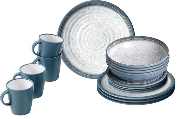 Geschirrset Melamin BRUNNER Tuscany 16-tlg. Fb. creme/blau je 4 x Ess-, Suppen-, Dessert- teller, Henkelbecher