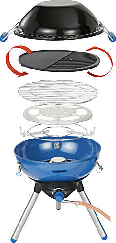 • Lieferumfang: Deckel mit Wok-Funktion, Topfkreuz, wendbare Grill- & Kontaktgrillplatte, Grillrost, Tragetasche aus Polyester, inkl. Schlauch mit Connector speziell für Caravans